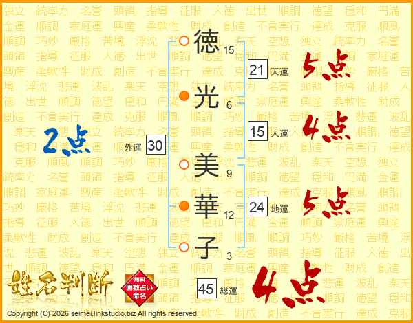徳(15画)光(6画) 美(9画)華(12画)子(3画)