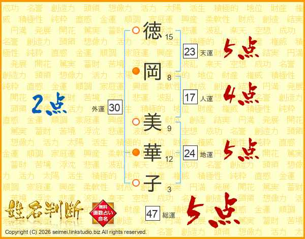 徳(15画)岡(8画) 美(9画)華(12画)子(3画)