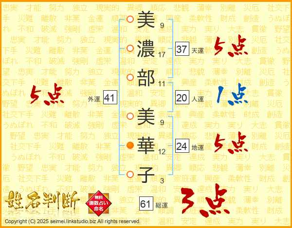 美(9画)濃(17画)部(11画) 美(9画)華(12画)子(3画)