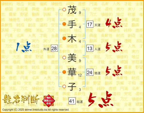 茂(9画)手(4画)木(4画) 美(9画)華(12画)子(3画)