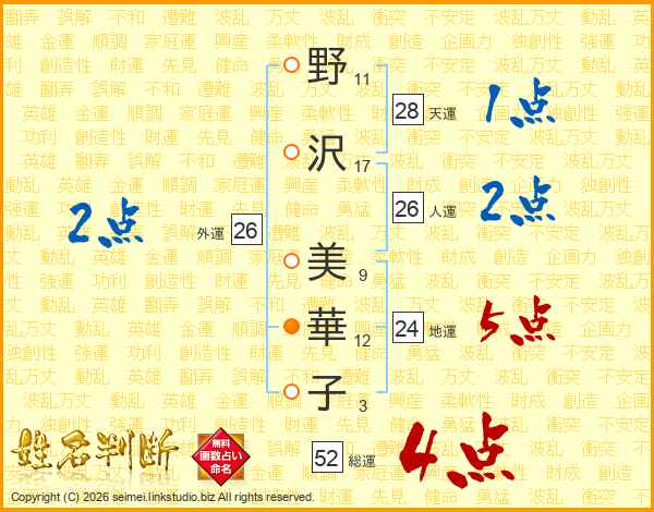 野(11画)沢(17画) 美(9画)華(12画)子(3画)