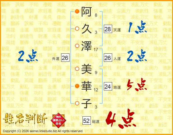 阿(8画)久(3画)澤(17画) 美(9画)華(12画)子(3画)