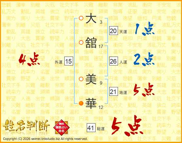 大(3画)舘(17画) 美(9画)華(12画)