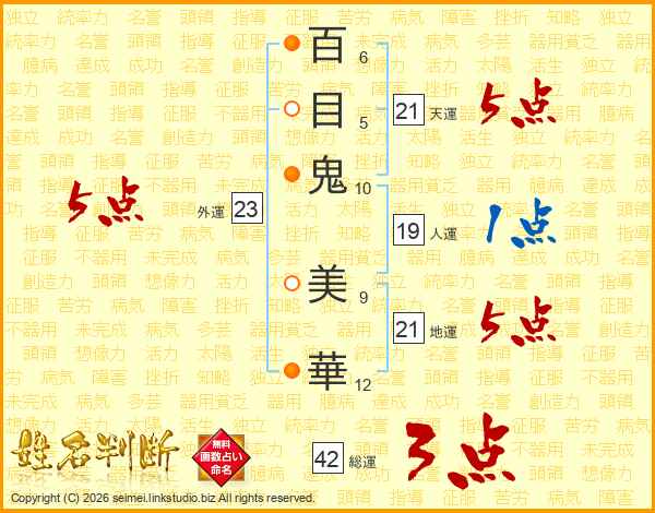 百目鬼美華さんの天運は21画の5点!