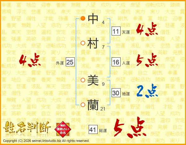 中村美蘭さんの総運は41画の5点!
