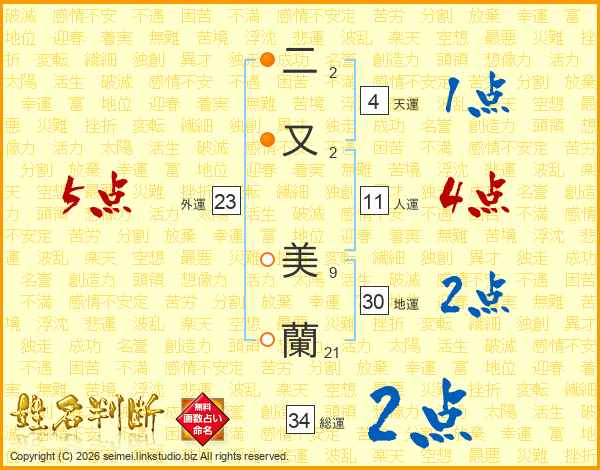 二又美蘭さんの人運は11画の4点!