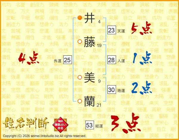 井(4画)藤(19画) 美(9画)蘭(21画)