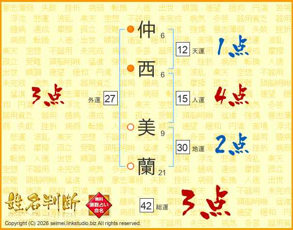 仲(6画)西(6画) 美(9画)蘭(21画)