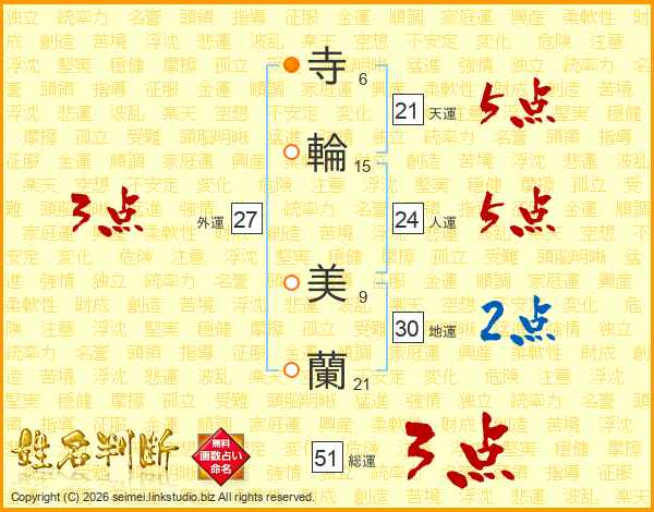寺(6画)輪(15画) 美(9画)蘭(21画)