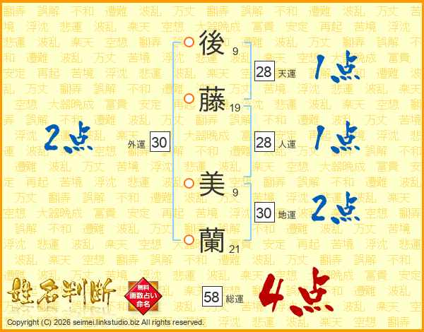 後(9画)藤(19画) 美(9画)蘭(21画)