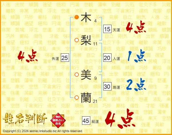 木(4画)梨(11画) 美(9画)蘭(21画)