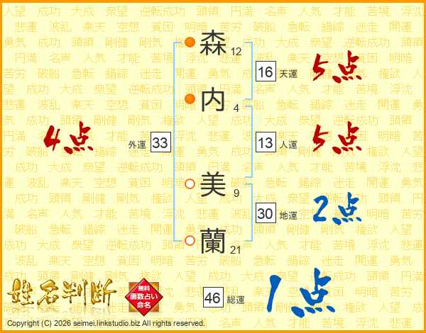 生活面を象徴する運勢です。外部から受ける影響力を表し、結婚運、家庭運や職場、環境への順応性を表します。総運から人運を引いた画数。姓や名が1文字の場合を除く。