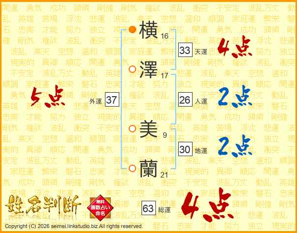 横(16画)澤(17画) 美(9画)蘭(21画)