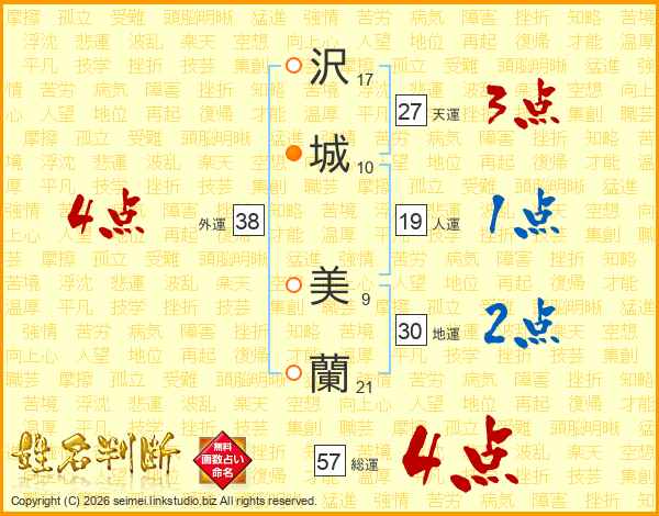 沢(17画)城(10画) 美(9画)蘭(21画)