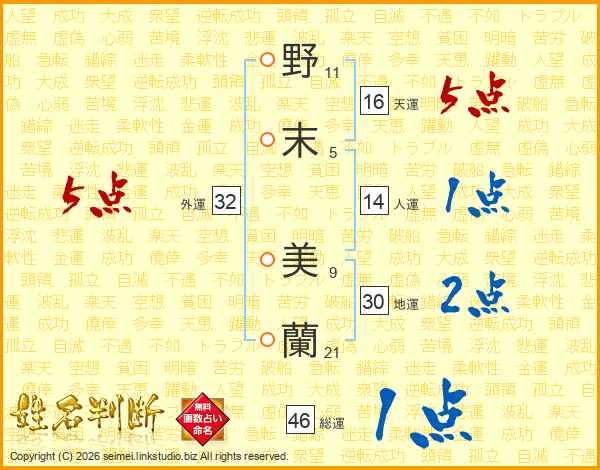 あなたの人生を表す1番重要な運勢です。生涯を通じて影響する総合運となり、主に50歳以降の晩年期に影響を及ぼします。苗字と名前の合計画数。