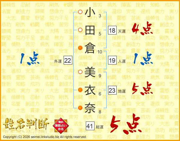 小(3画)田(5画)倉(10画) 美(9画)衣(6画)奈(8画)