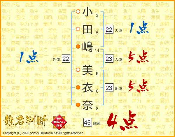 小(3画)田(5画)嶋(14画) 美(9画)衣(6画)奈(8画)