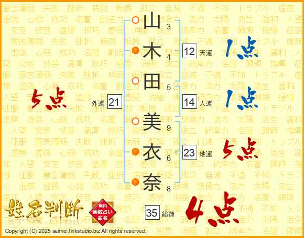 山(3画)木(4画)田(5画) 美(9画)衣(6画)奈(8画)
