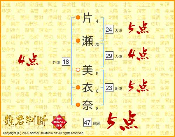 片(4画)瀬(20画) 美(9画)衣(6画)奈(8画)