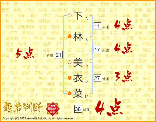 下(3画)林(8画) 美(9画)衣(6画)菜(12画)