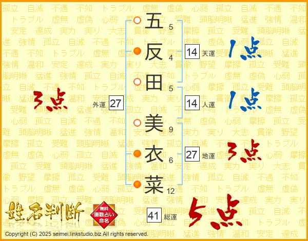 生活面を象徴する運勢です。外部から受ける影響力を表し、結婚運、家庭運や職場、環境への順応性を表します。総運から人運を引いた画数。姓や名が1文字の場合を除く。