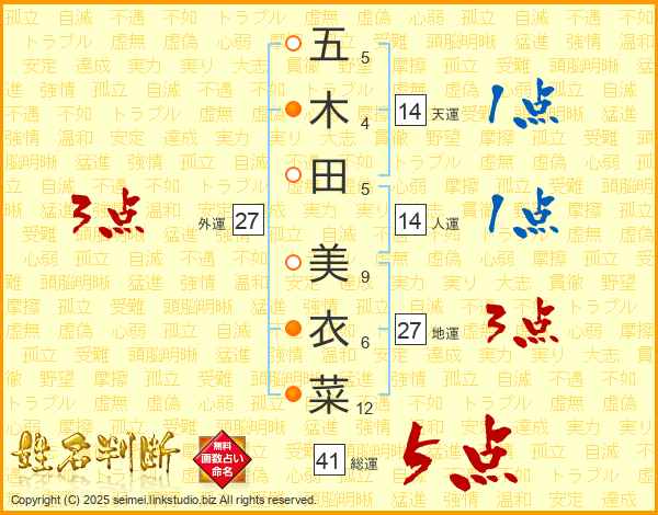 五(5画)木(4画)田(5画) 美(9画)衣(6画)菜(12画)