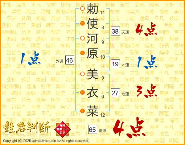勅(11画)使(8画)河(9画)原(10画) 美(9画)衣(6画)菜(12画)