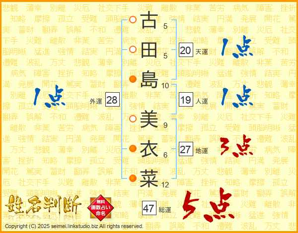 古(5画)田(5画)島(10画) 美(9画)衣(6画)菜(12画)