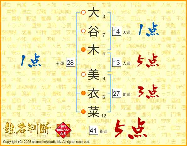 大(3画)谷(7画)木(4画) 美(9画)衣(6画)菜(12画)