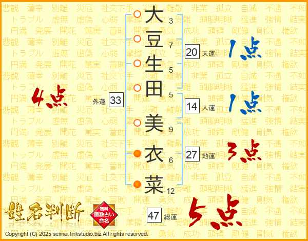 大(3画)豆(7画)生(5画)田(5画) 美(9画)衣(6画)菜(12画)
