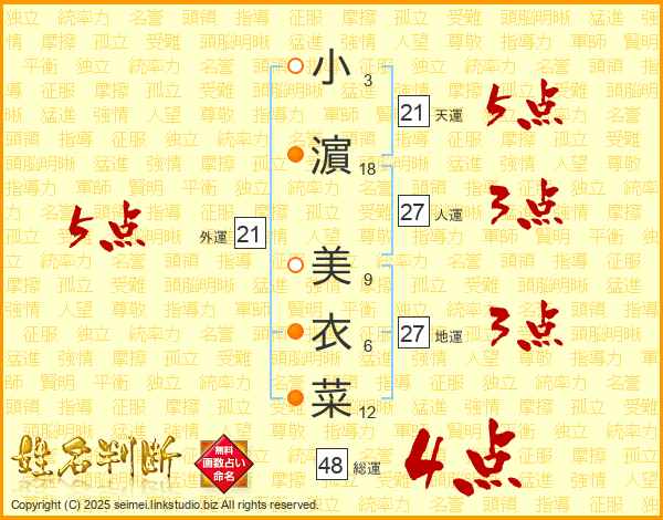 小濵美衣菜さんの天運は21画の5点!