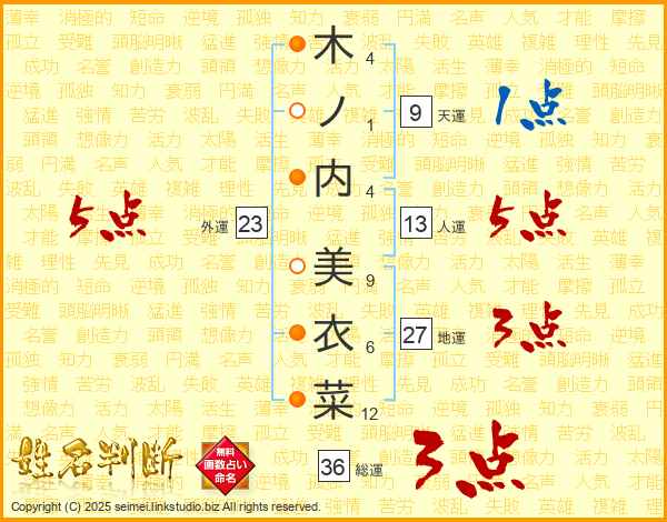 木(4画)ノ(1画)内(4画) 美(9画)衣(6画)菜(12画)