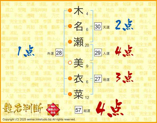 木(4画)名(6画)瀬(20画) 美(9画)衣(6画)菜(12画)