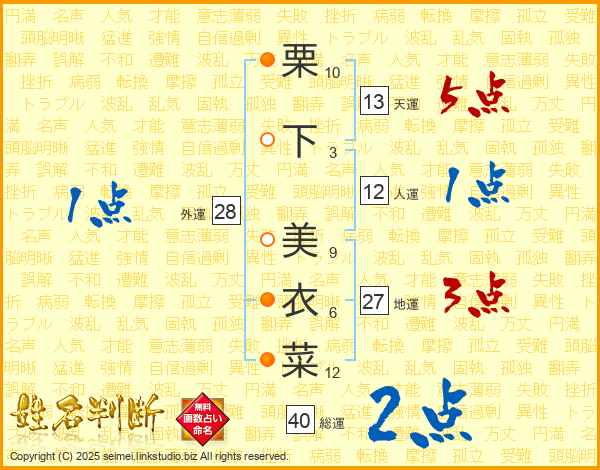 生活面を象徴する運勢です。外部から受ける影響力を表し、結婚運、家庭運や職場、環境への順応性を表します。総運から人運を引いた画数。姓や名が1文字の場合を除く。
