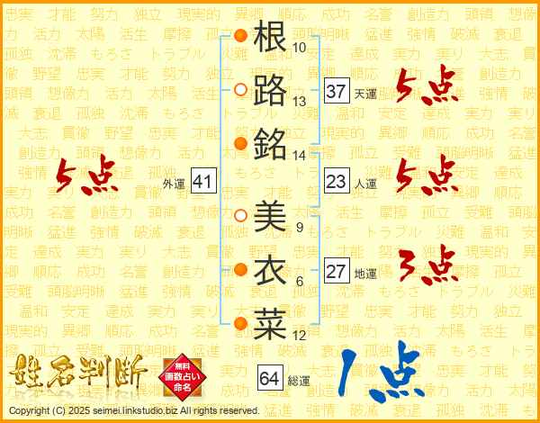 根(10画)路(13画)銘(14画) 美(9画)衣(6画)菜(12画)