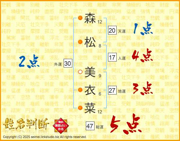 森(12画)松(8画) 美(9画)衣(6画)菜(12画)