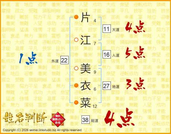 片(4画)江(7画) 美(9画)衣(6画)菜(12画)