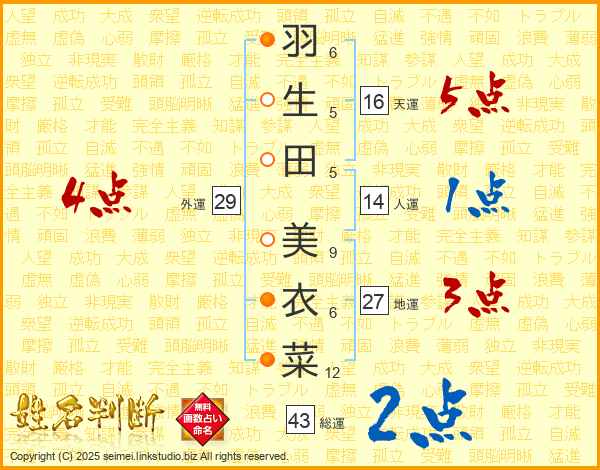 羽(6画)生(5画)田(5画) 美(9画)衣(6画)菜(12画)