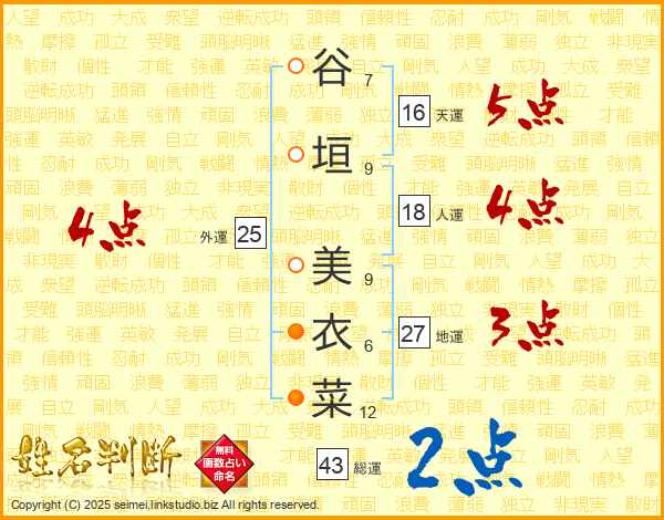 谷(7画)垣(9画) 美(9画)衣(6画)菜(12画)