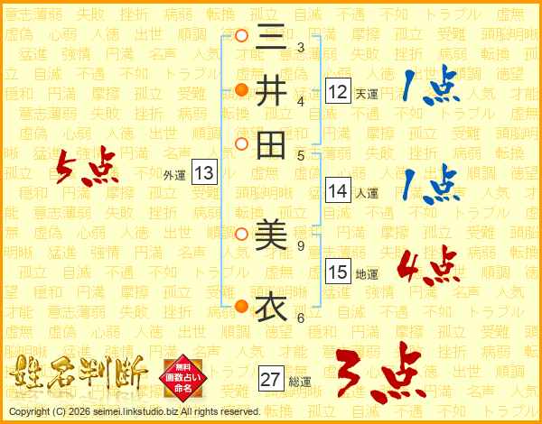 三(3画)井(4画)田(5画) 美(9画)衣(6画)