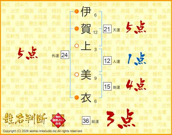 伊(6画)賀(12画)上(3画) 美(9画)衣(6画)