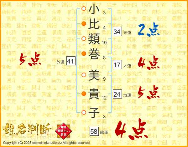 小(3画)比(4画)類(19画)巻(8画) 美(9画)貴(12画)子(3画)