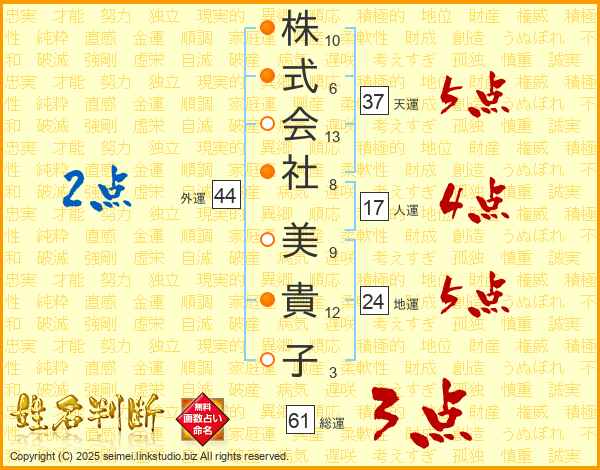 株(10画)式(6画)会(13画)社(8画) 美(9画)貴(12画)子(3画)