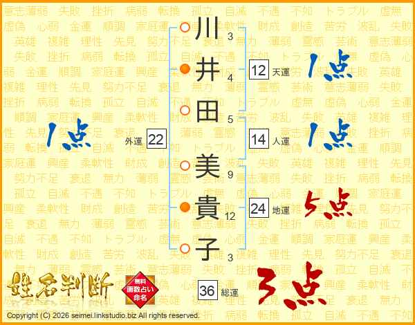 川(3画)井(4画)田(5画) 美(9画)貴(12画)子(3画)