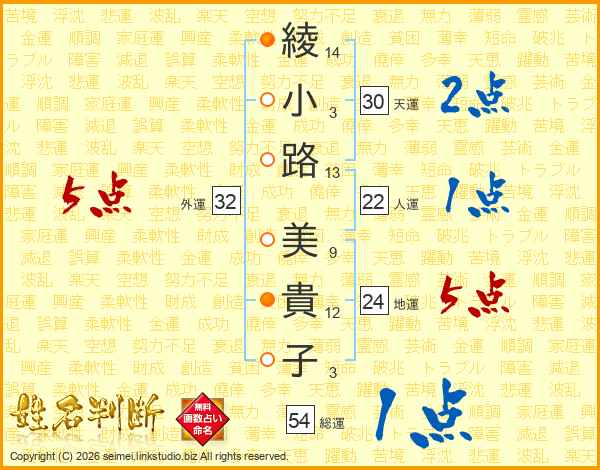 綾(14画)小(3画)路(13画) 美(9画)貴(12画)子(3画)
