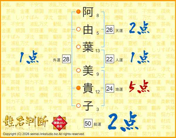 阿(8画)由(5画)葉(13画) 美(9画)貴(12画)子(3画)
