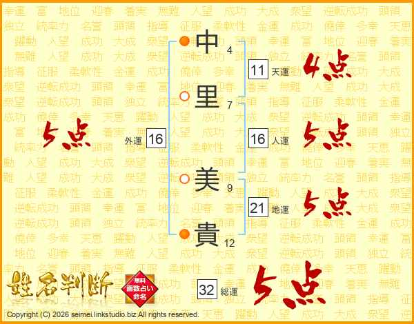 生活面を象徴する運勢です。外部から受ける影響力を表し、結婚運、家庭運や職場、環境への順応性を表します。総運から人運を引いた画数。姓や名が1文字の場合を除く。