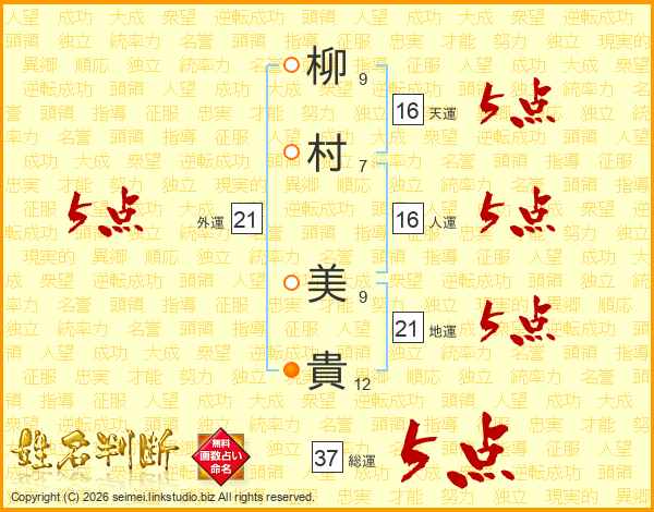 柳(9画)村(7画) 美(9画)貴(12画)
