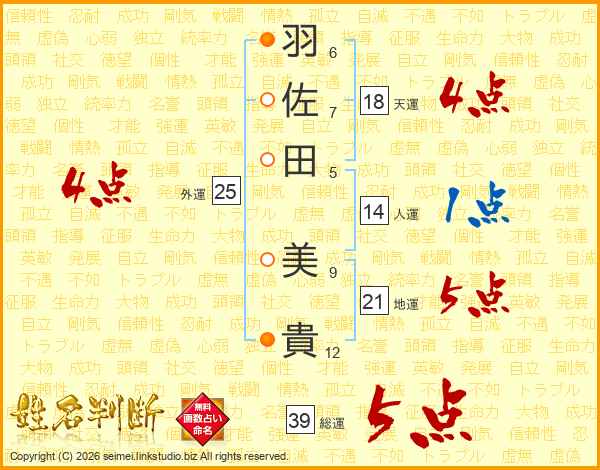 羽(6画)佐(7画)田(5画) 美(9画)貴(12画)