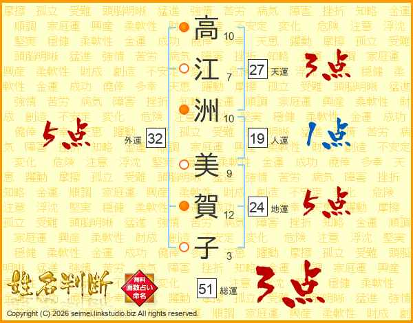 高(10画)江(7画)洲(10画) 美(9画)賀(12画)子(3画)